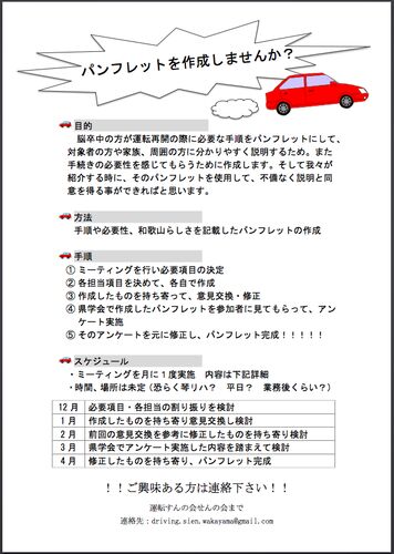 今後の会の方向性ですが、 脳卒中患者の自動車運転再開に向けての パンフレット作成をしていきたいと思います!!! 脳卒中の方に自動車運転再開に向けて 『こんな手続きが必要ですよ!!』と紹介する時に その一連の流れや必要性が紙になっていたら説明しや…